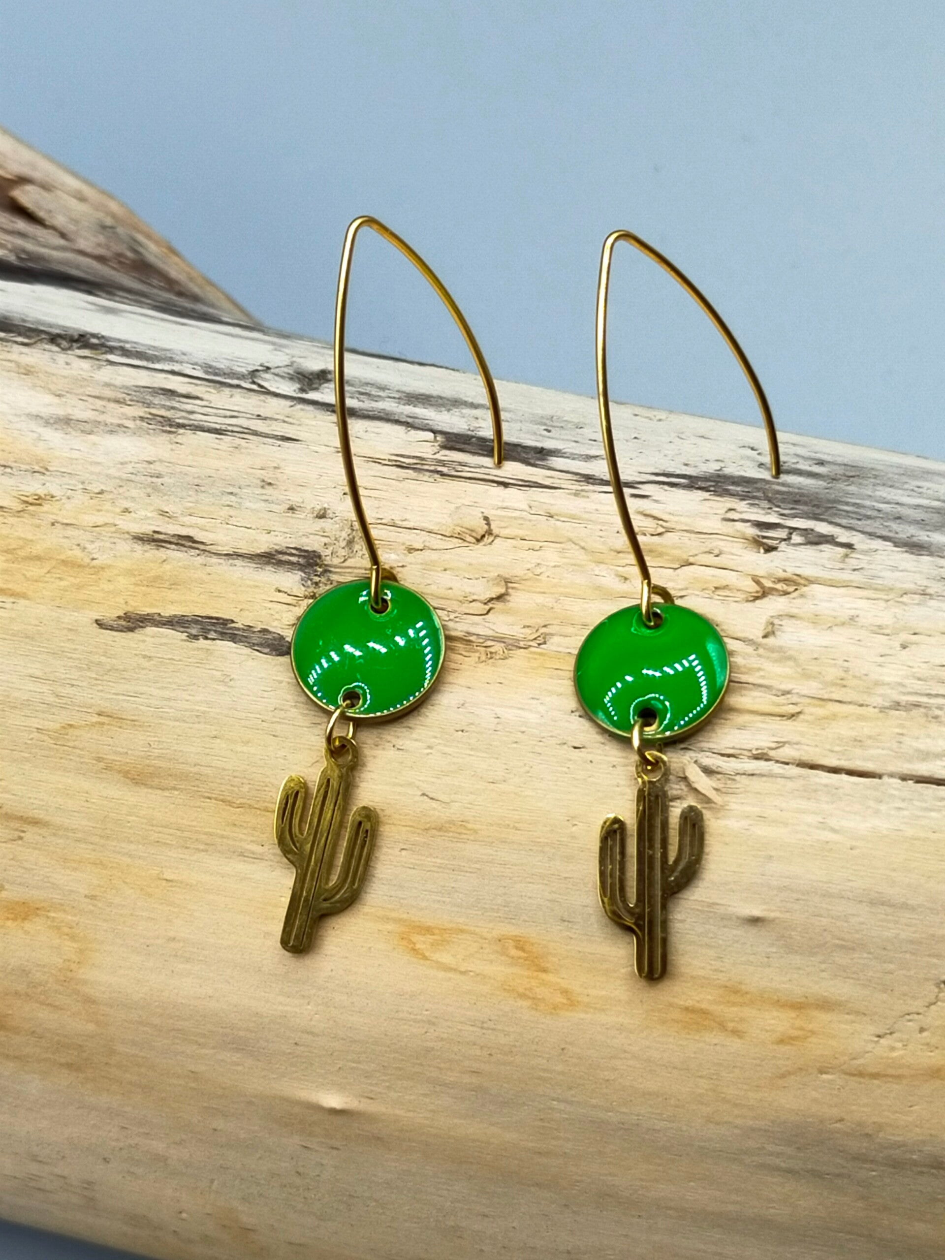 Apportez du piquant à votre tenue avec ces boucles grand corchet ouvert en acier inoxydable doré avec breloque ronde émaillée verte et un 🌵 !